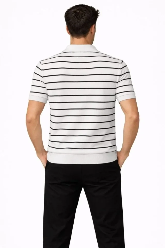 Erkek Triko Polo Yaka Fermuarlı Çizgili Tişört T-Shirt Yazlık Şık - Beyaz