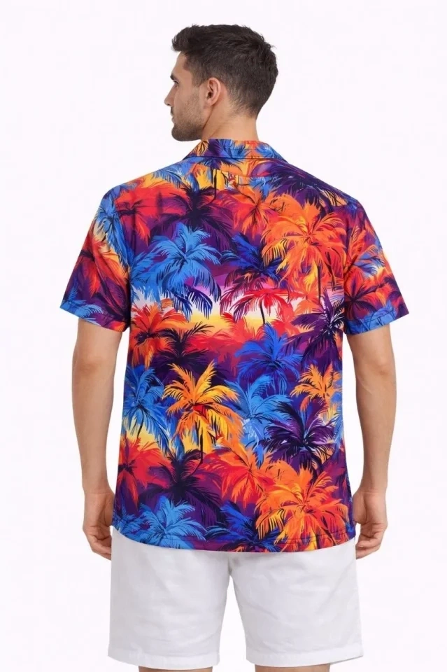 Erkek Tropikal Palmiye Desenli Kısa Kol Gömlek Yazlık Rahat Kalıp Dijital Baskılı - Desenli