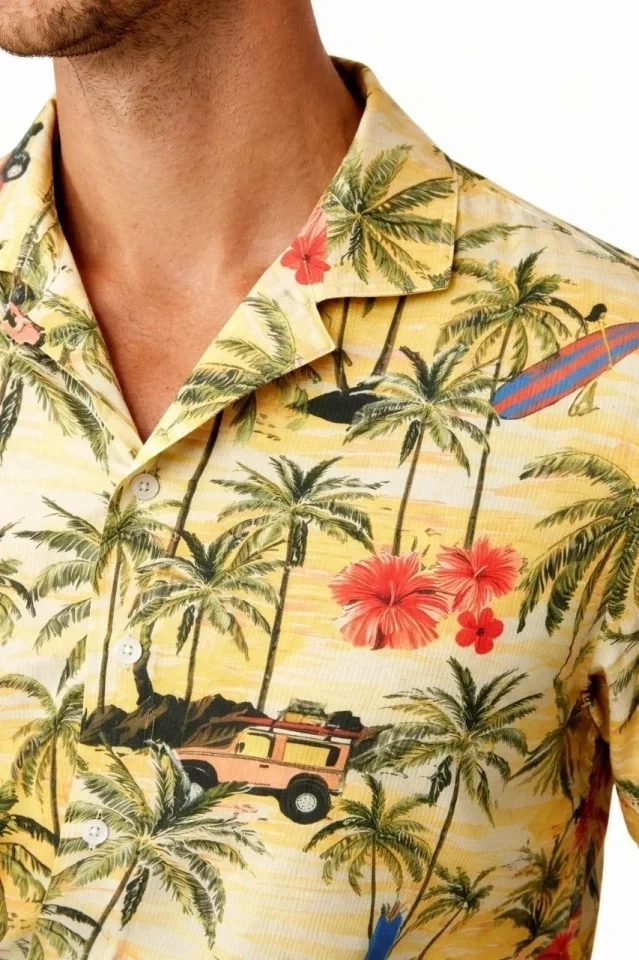 Erkek Tropikal Palmiye Desenli Kısa Kol Gömlek Yazlık Rahat Kalıp Dijital Baskılı - Desenli