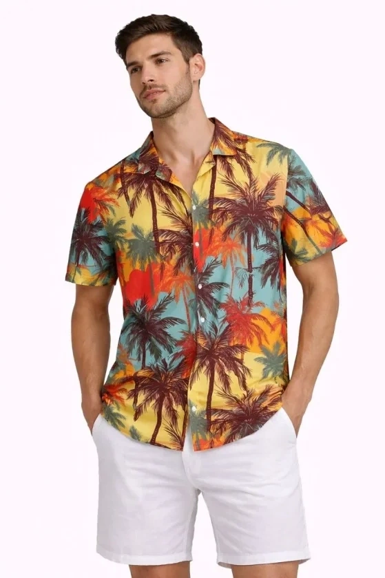 Erkek Hawaii Tarz Tropikal Palmiye Desenli Kısa Kol Gömlek Rahat Kalıp Yazlık - Desenli