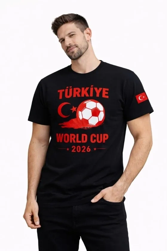 Erkek TÜRKİYE Baskılı Tişört 2026 Dünya Kupası Taraftar Forma T-Shirt - Siyah