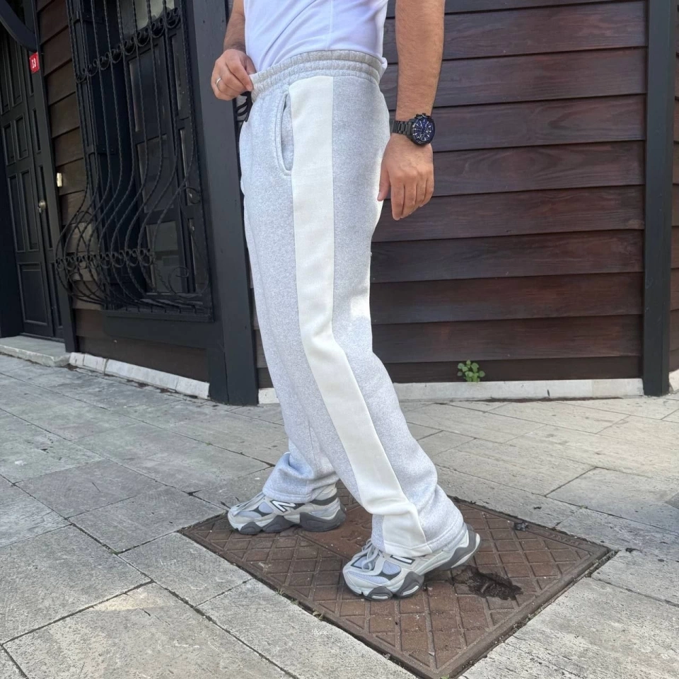 Erkek Üç İplik Kışlık Pamuklu Yandan Garneli Kalın Bej Şeritli Cepli Eşofman Altı - Gri