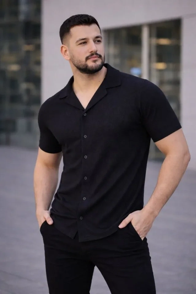 Erkek Waffle Kumaş Kısa Kollu Gömlek Şort Takım Regular Fit Yazlık İkili Set - Siyah