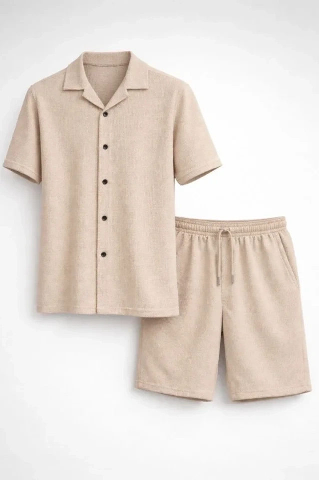 Erkek Waffle Kumaş Kısa Kollu Gömlek Şort Takım Regular Fit Yazlık İkili Set - Bej