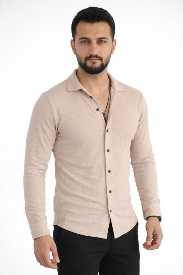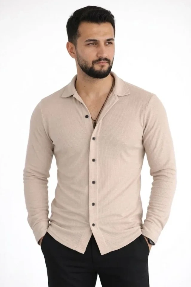 Erkek Waffle Kumaş Uzun Kollu Düğmeli Açık Yaka Regular Fit Gömlek - Bej