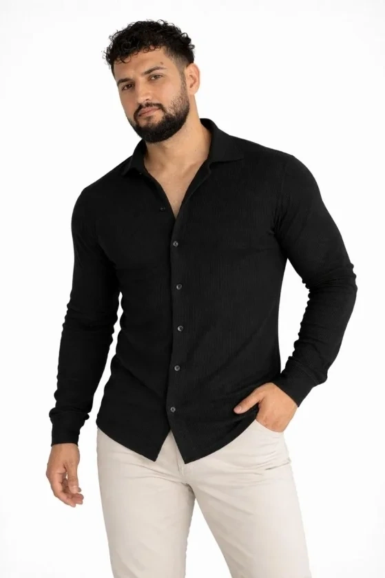 Erkek Waffle Kumaş Uzun Kollu Düğmeli Açık Yaka Regular Fit Gömlek - Siyah