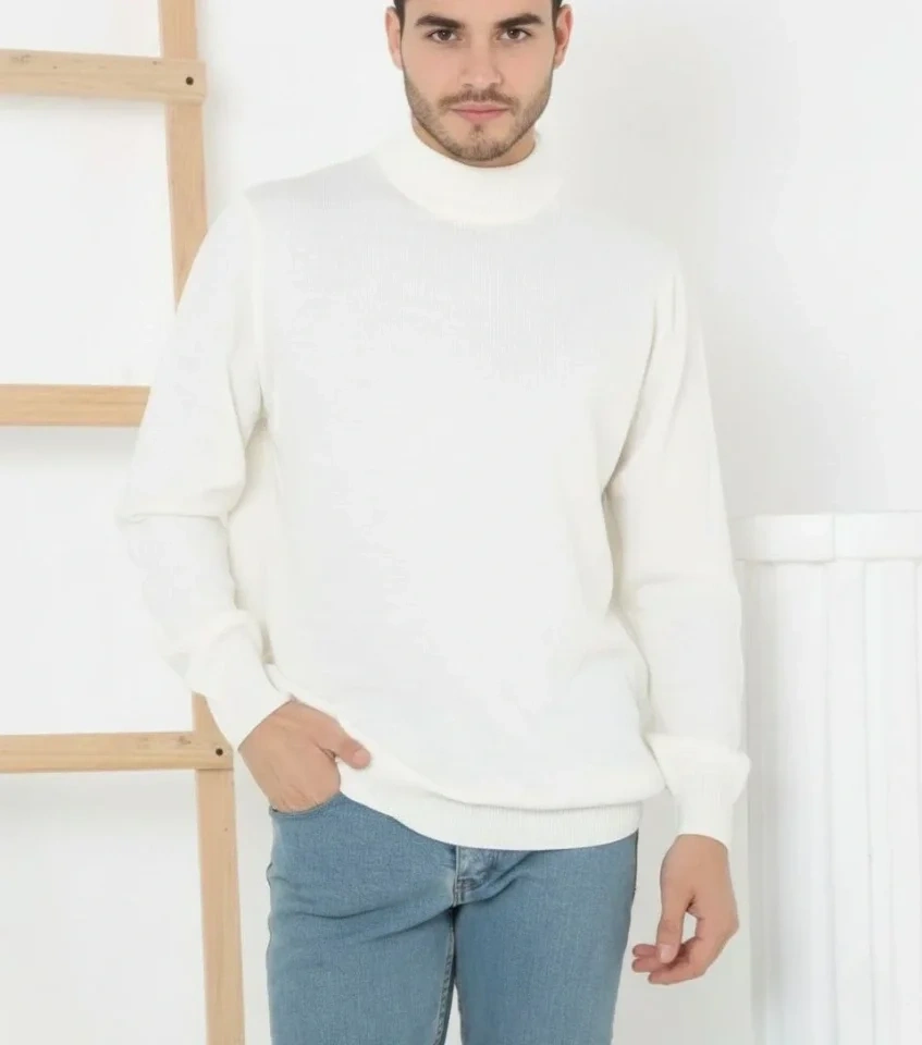 Erkek Yarım Boğaz Triko Kazak Yumuşak Dokulu Pamuklu Ince Dokuma, Uzun Kollu Rahat Regular Kalıp - Beyaz