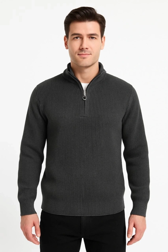 Erkek Yarım Fermuarlı Triko Kazak – Selanik Örgü, Dik Yaka, Pamuklu Dokuma, Regular Fit Uzun Kollu Kışlık Model - Füme