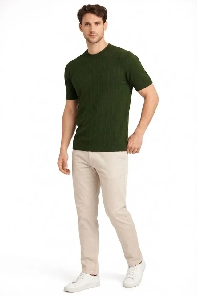 Erkek Yazlık Fitilli Triko Tişört Kısa Kol Bisiklet Yaka T-Shirt - Haki