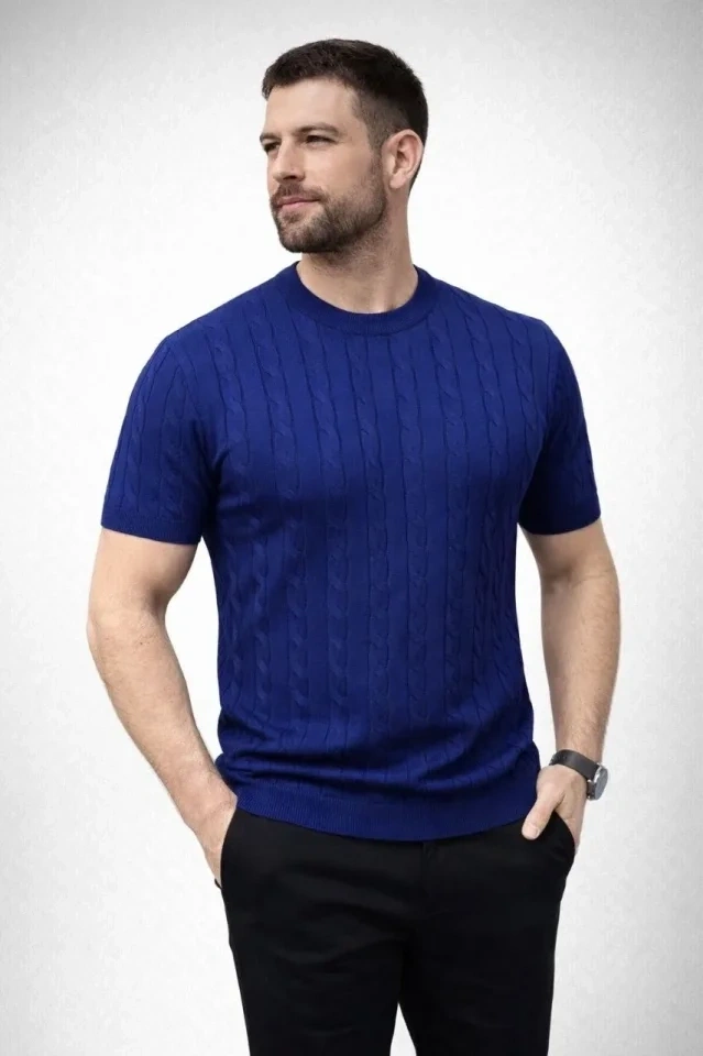 Erkek Örgü Desenli Renkli Kısa Kollu Triko Tişört