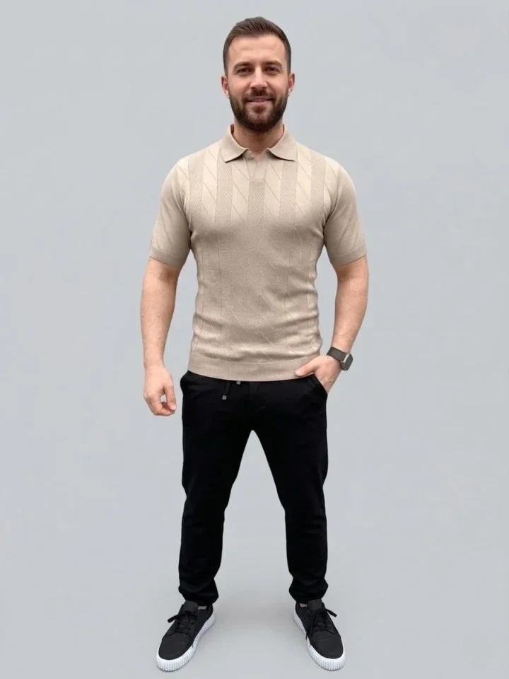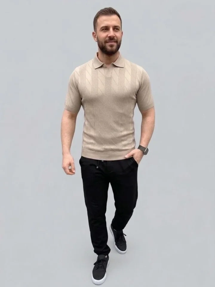 Erkek Yazlık Triko Dokuma Tişört Kısa Kol Polo Yaka T-Shirt - Bej