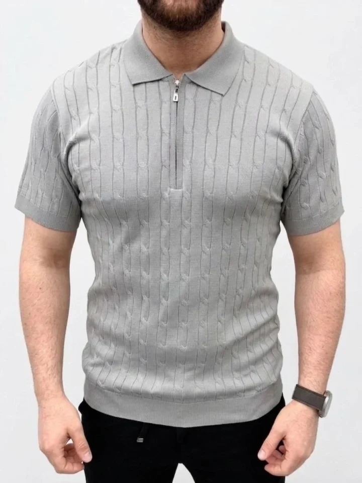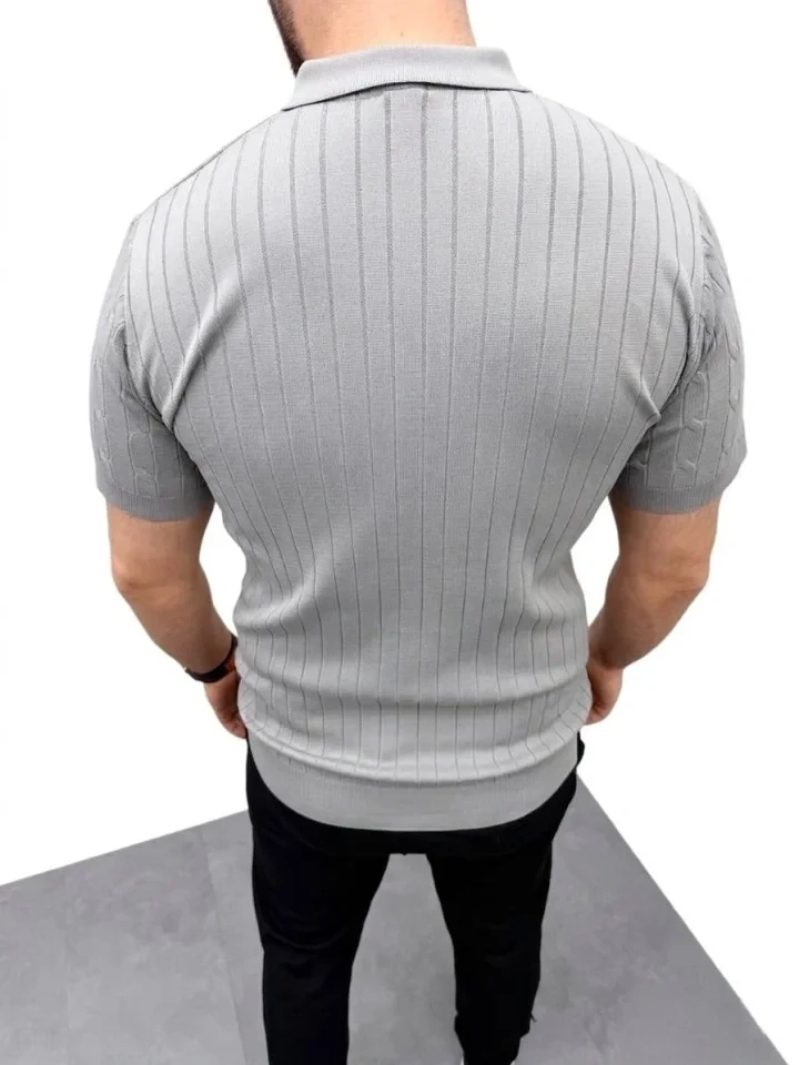 Erkek Yazlık Triko Saç Örgü Tişört Kısa Kol Polo Yaka Fermuarlı T-Shirt - Gri