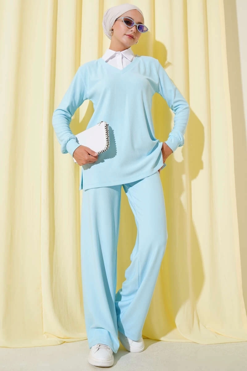 Gömlek Yaka Fitilli Salaş İkili Takım Buz Mavisi T4300