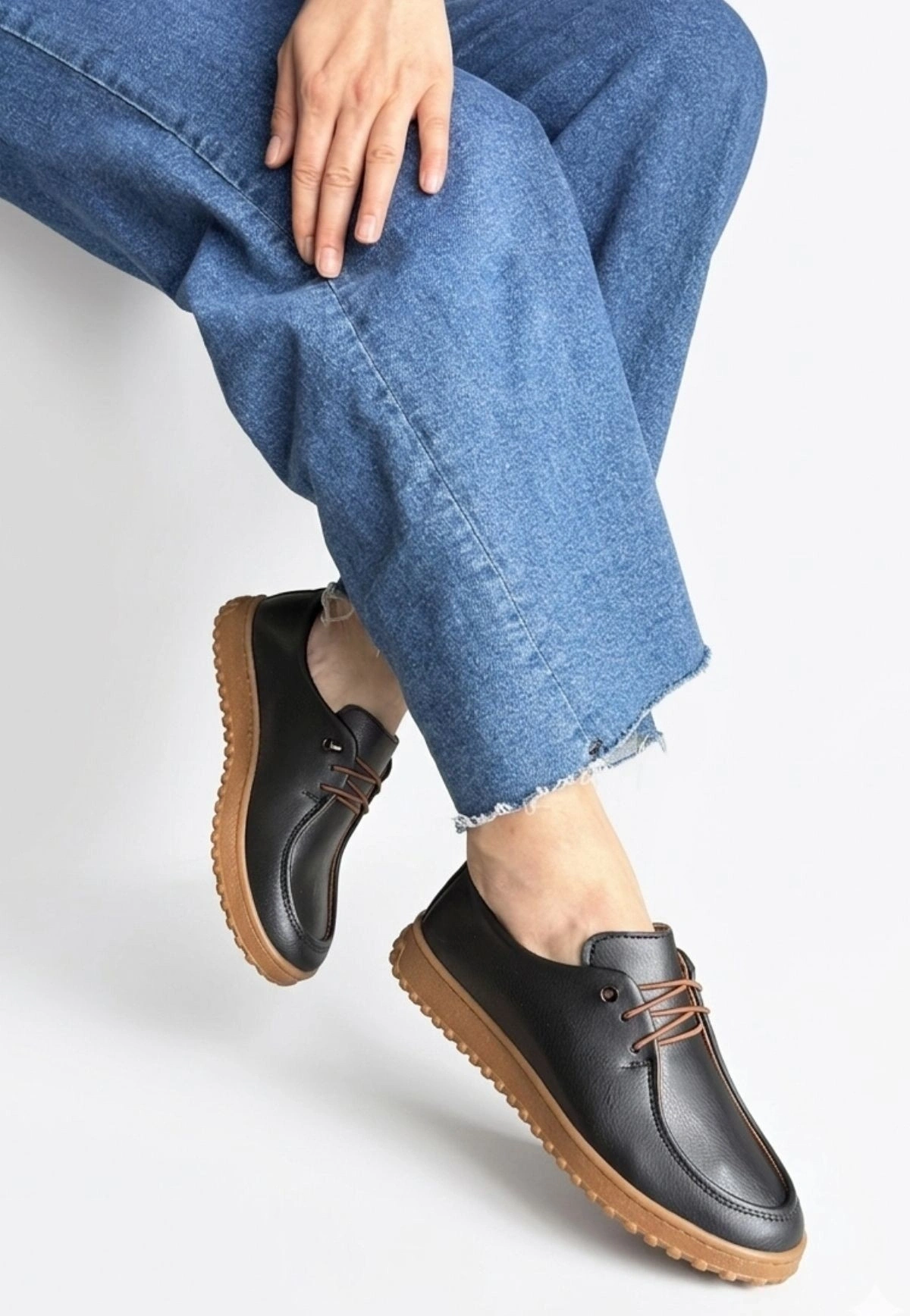 Guot Siyah Cilt Bağcıklı Babet Ayakkabı