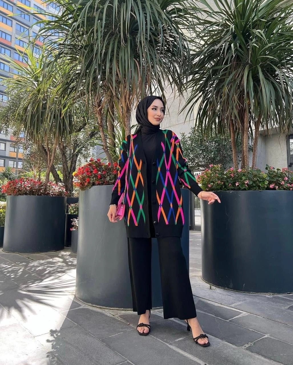 Bu hırkalı ikili takım, şıklığı ve rahatlığı bir arada sunar. Çok renkli triko detaylarıyla dikkat çeker.