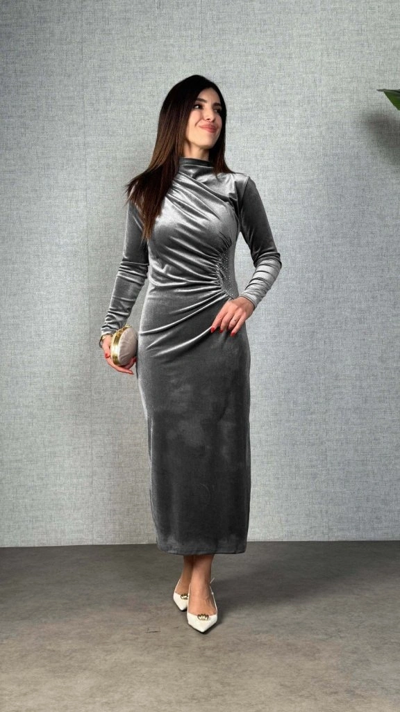 Kadı Uzun Kollu Omuzdan Büzgülü Yandan Taş Detaylı Uzun Kadife Elbise