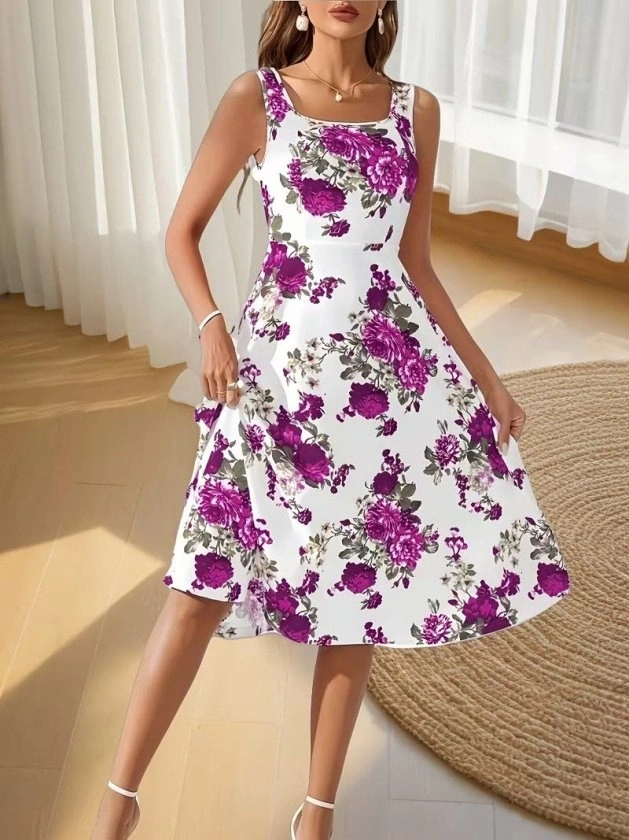 Kadın Askılı Kare Yakalı çiçek Desenli Midi Dalgıç Elbise