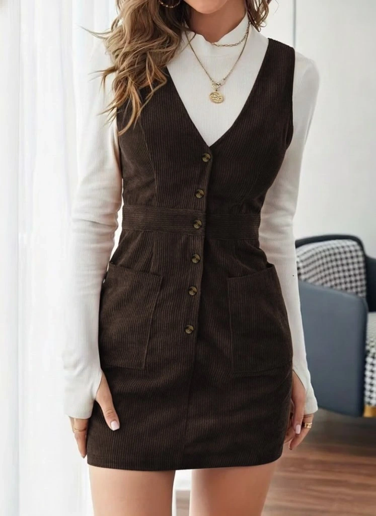 Kadın Askılı V Yakalı önden Düğmeli Mini Kalın Fitilli Kadife Elbise