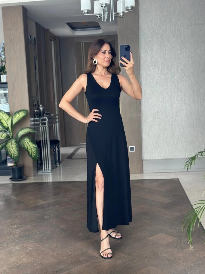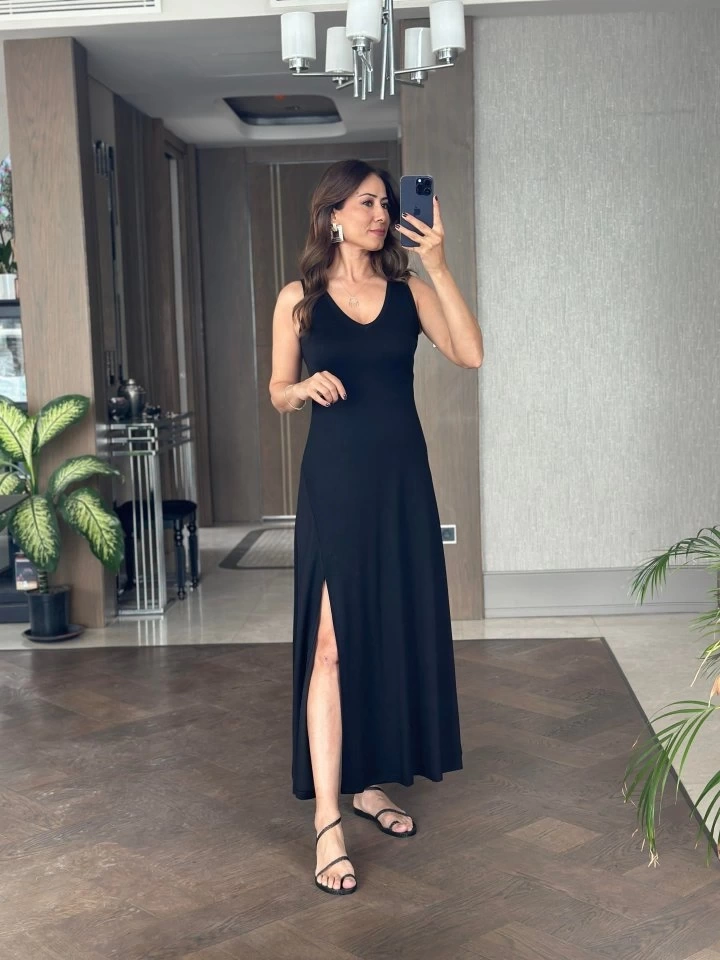 Kadın Askılı V Yakalı Yırtmaçlı Viskon Elbise