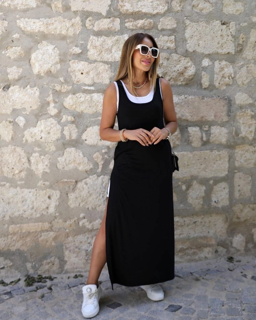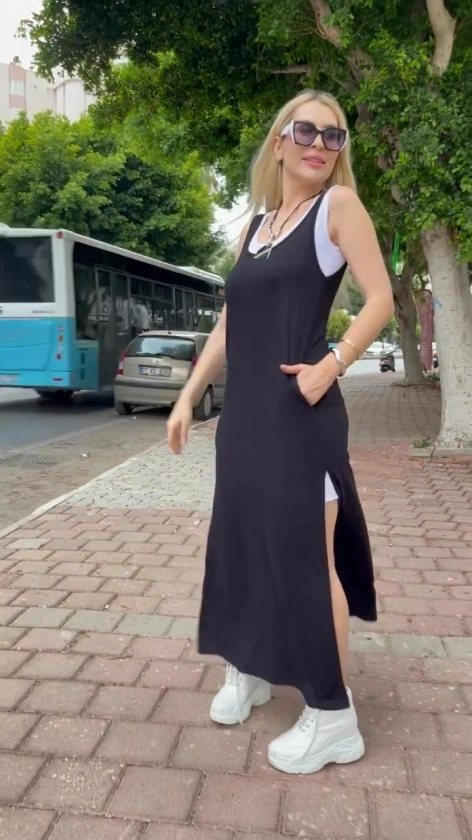 Kadın Askılı Yuvarlak Yakalı Cepli Yırtmaç Detaylı Viskon Elbise Ve Atlet Ikili Takım