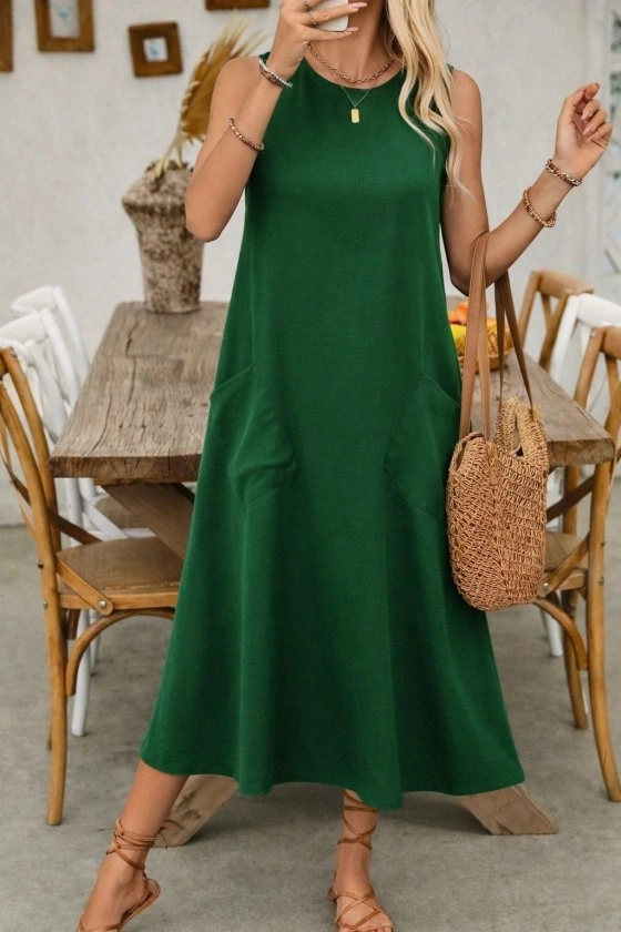 Kadın Askılı Yuvarlak Yakalı Kıloş Cepli Uzun Elbise