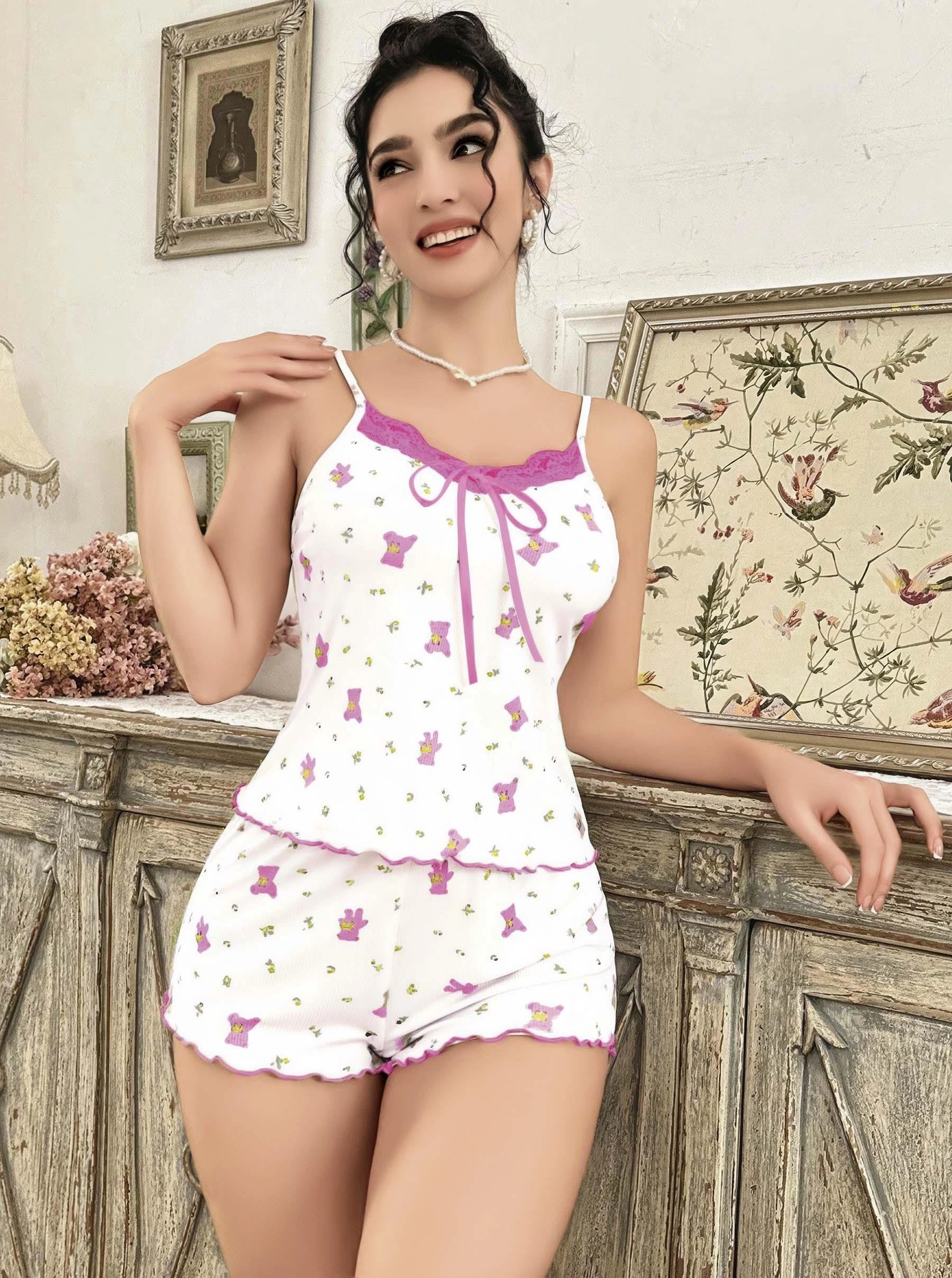Ayıcık ve Çiçek desenli şortlu gecelik takımı, eğlenceli ve dikkat çekici bir tasarıma sahiptir. Hafif kumaşı ile rahat kullanım sunarken enerjik bir stil yaratır.