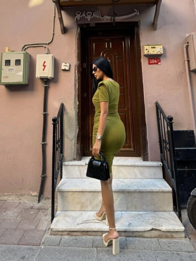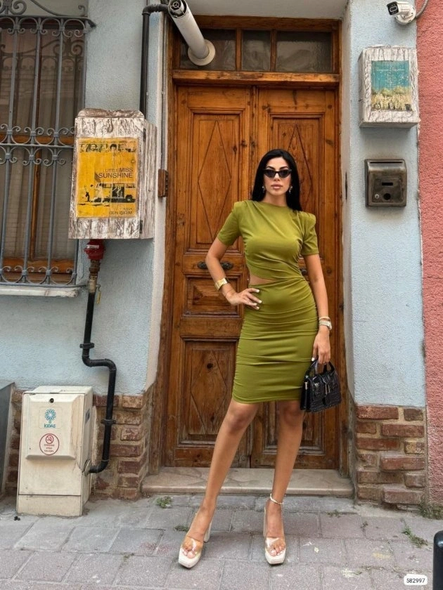 Kadın Bel Dekolteli Yanı Büzgü Detay Dalgıç Krep Kumaş Mini Elbise