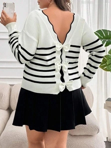 Kadın Beyaz Sırt Bağlama Detaylı çizgi Desen Triko Bluz