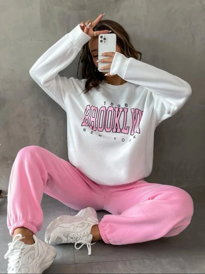 Kadın Bisiklet Yaka Brooklyn Baskılı üç Iplik Kumaş Sweat