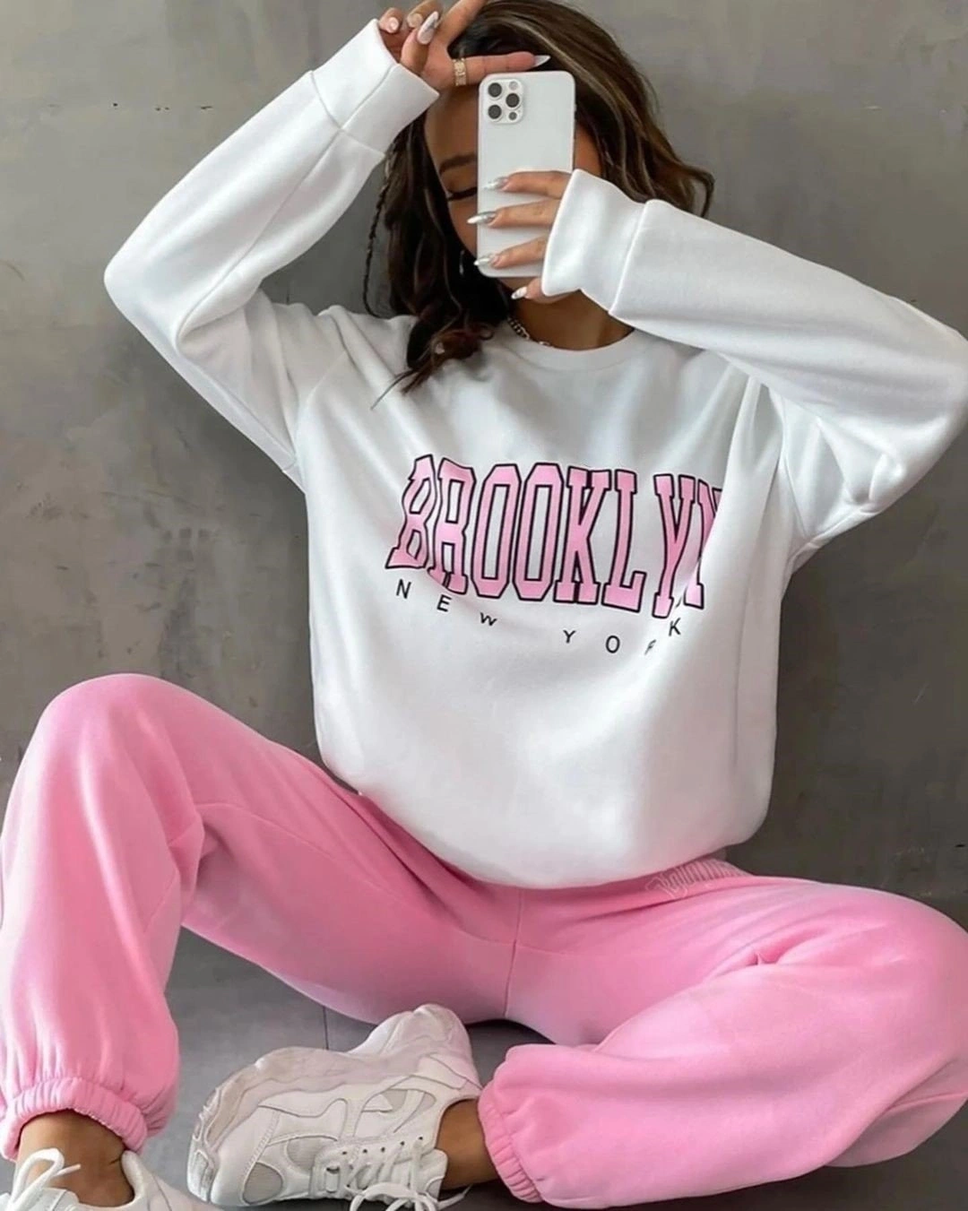 Kadın Bisiklet Yaka Brooklyn Baskılı üç Iplik Kumaş Sweat