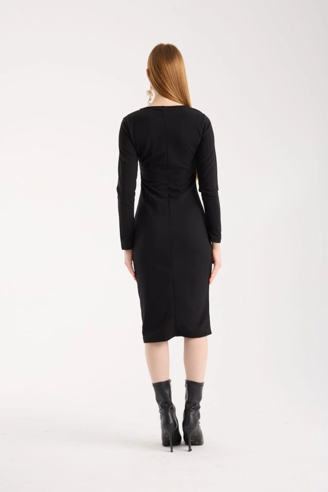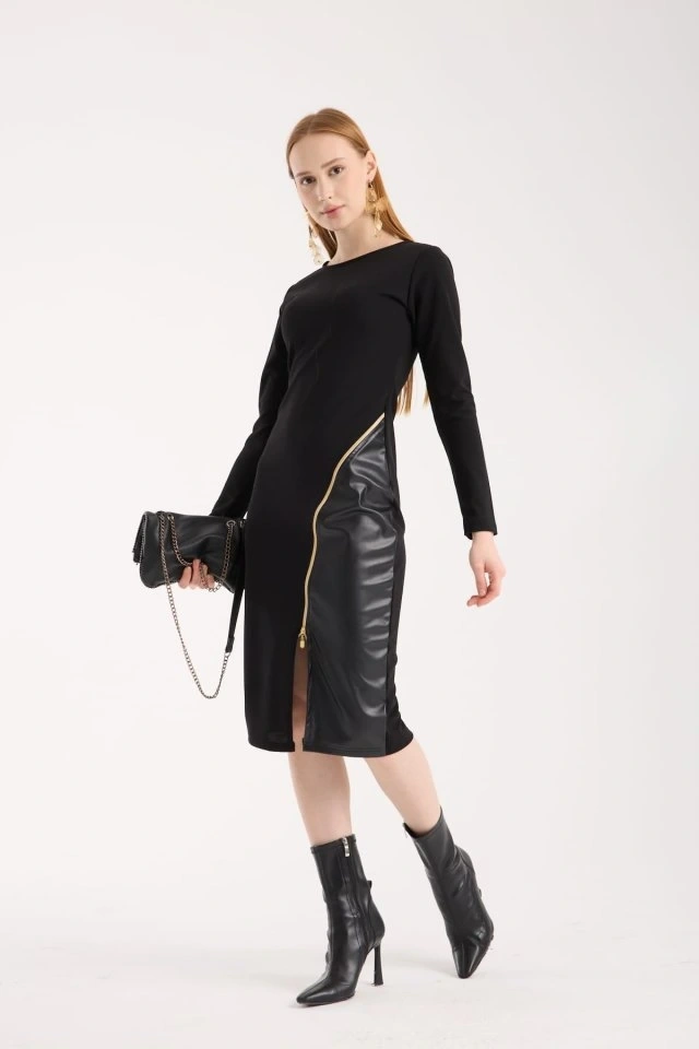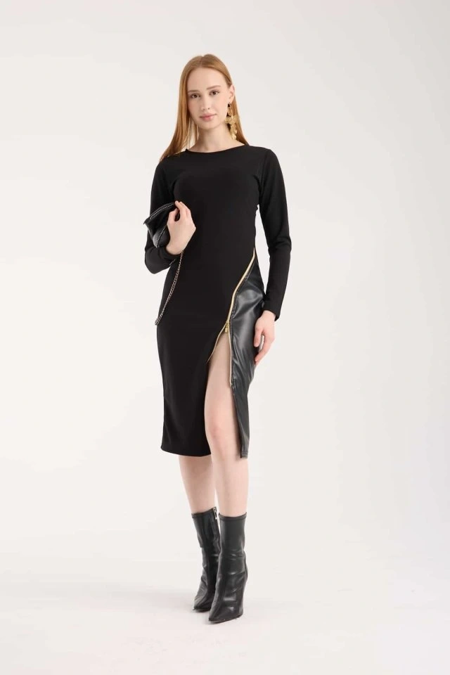 Kadın Bisiklet Yaka Uzun Kollu Deri Ve Fermuar Detay Mini Yırtmaçlı Elbise