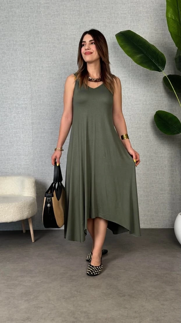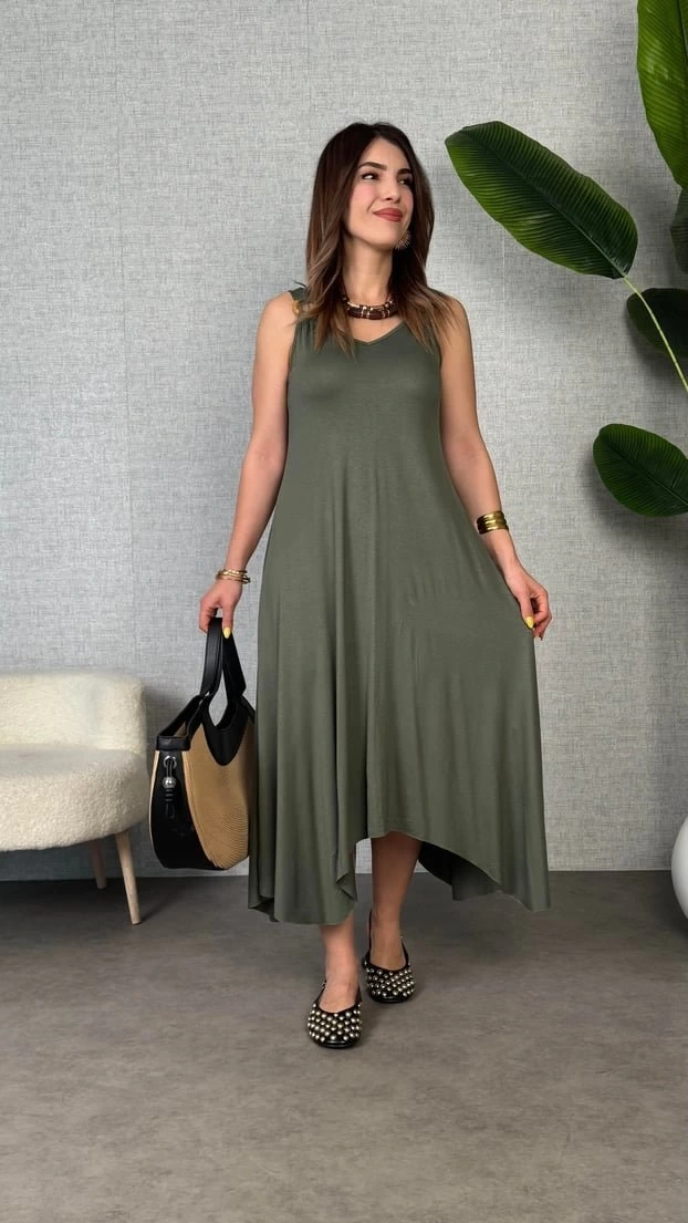 Kadın çan Dokuma Kumaş V Yaka Asimetrik Kesim Elbise