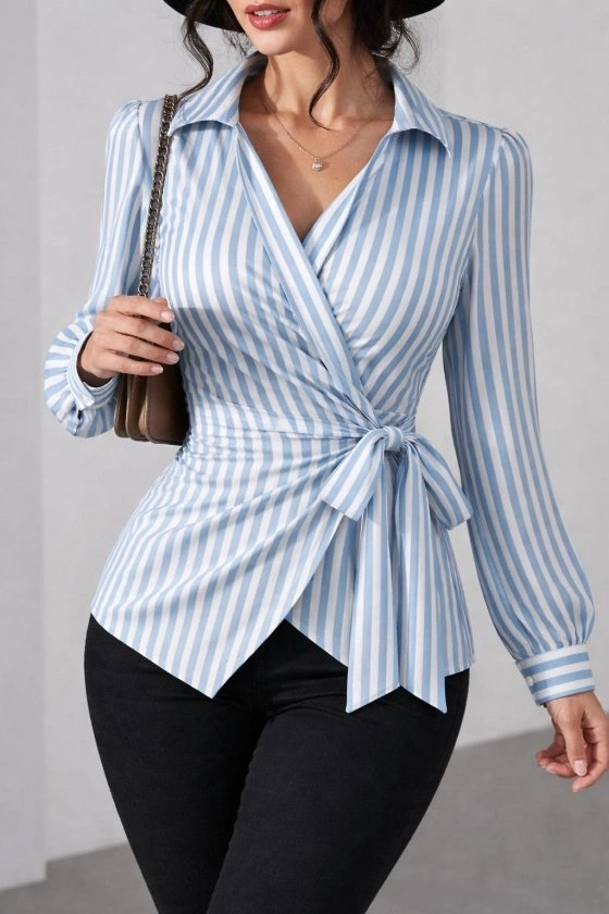 Kadın çizgili Kruvaze Bağlamalı Gömlek