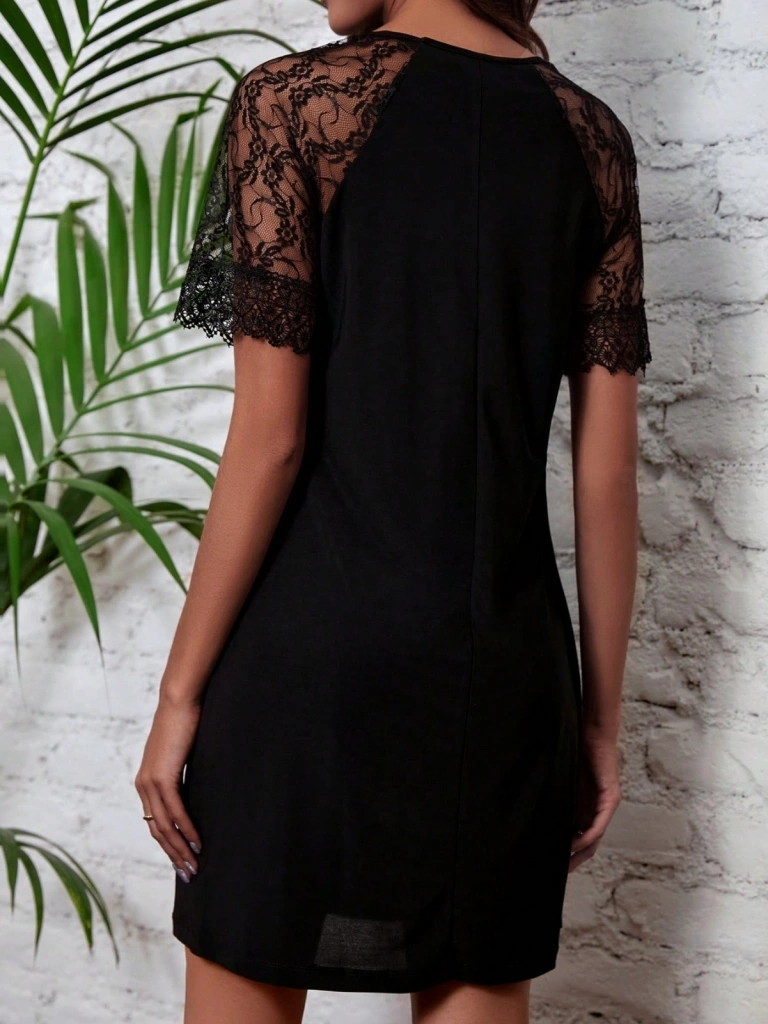 Kadın Dantelli Kısa Kollu Damla Yaka Krep Elbise