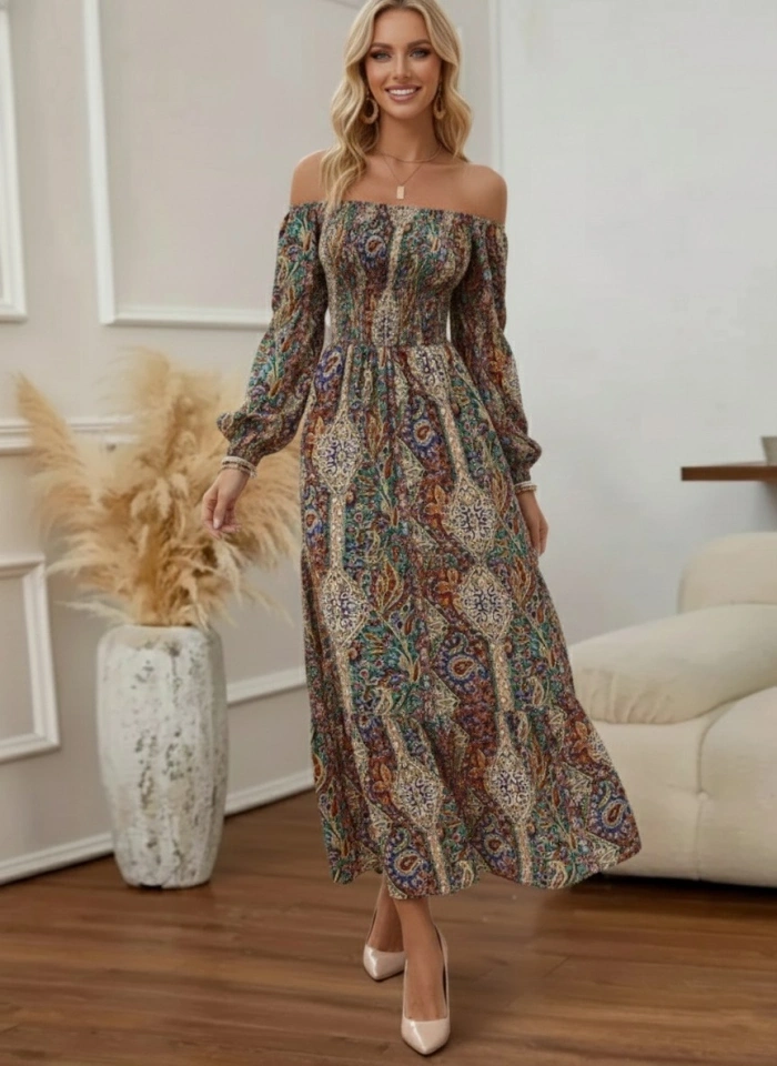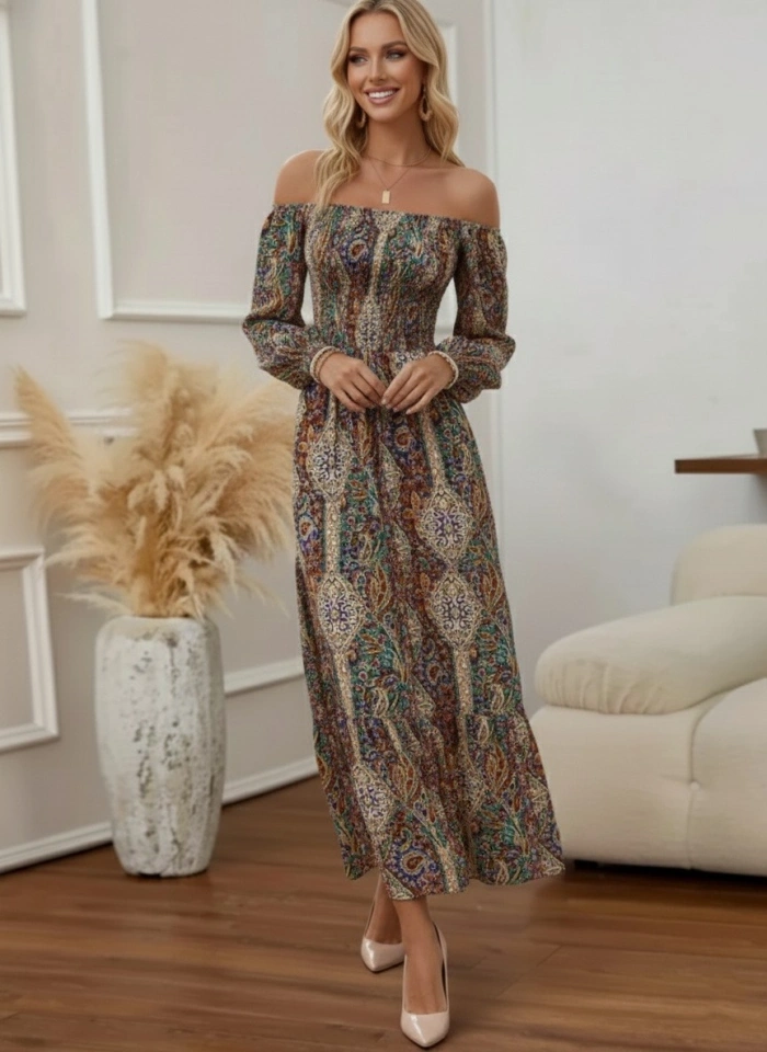 Kadın Düşük Omuzlu Beli Büzgülü Dijital Desenli Kesik Elyaf Süprem Uzun Elbise