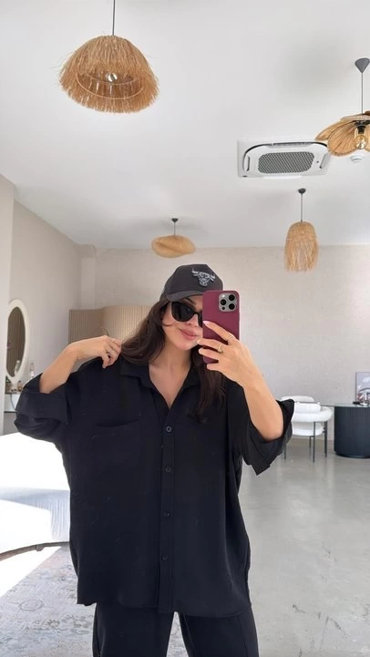 Kadın Flamlı Keten Tek Cep Oversızed Gömlek