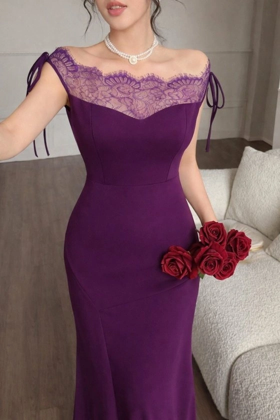 Kadın Göğüs Ve Yakası Dantel Detaylı Kayık Yaka Görünümlü Uzun Ithal Krep Elbise