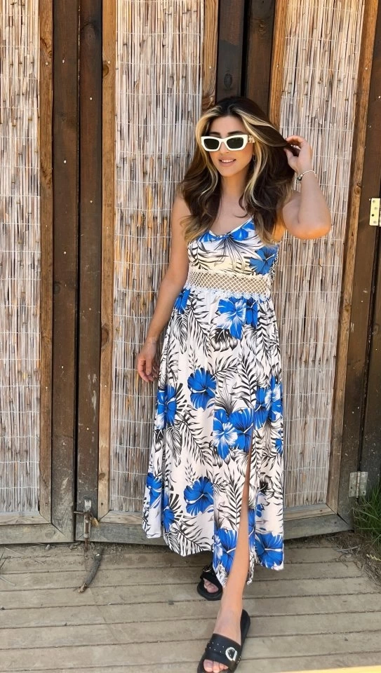 Kadın Ip Askılı V Yakalı Bel Güpür çiçek Desenli Yandan Yırtmaçlı Maksi Süprem Elbise