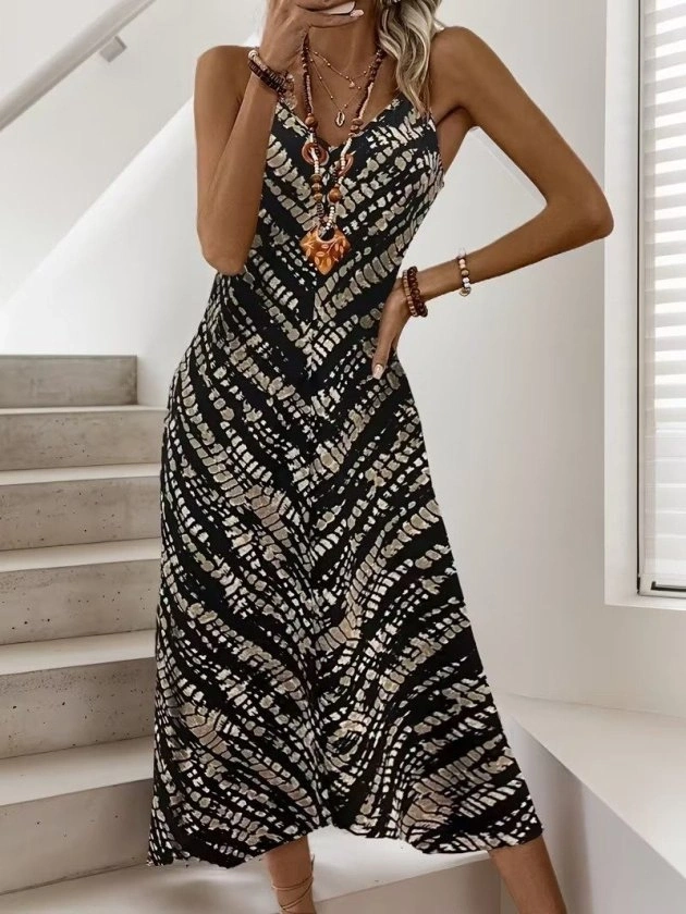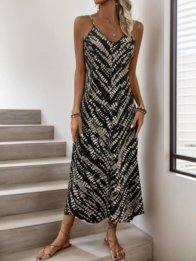 Kadın Ip Askılı V Yakalı Desenli Uzun Süprem Elbise