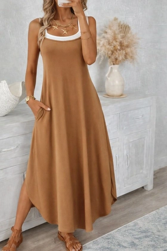 Kadın Ip Askılı Yuvarlak Yakalı Cepli Uzun Viskon Elbise
