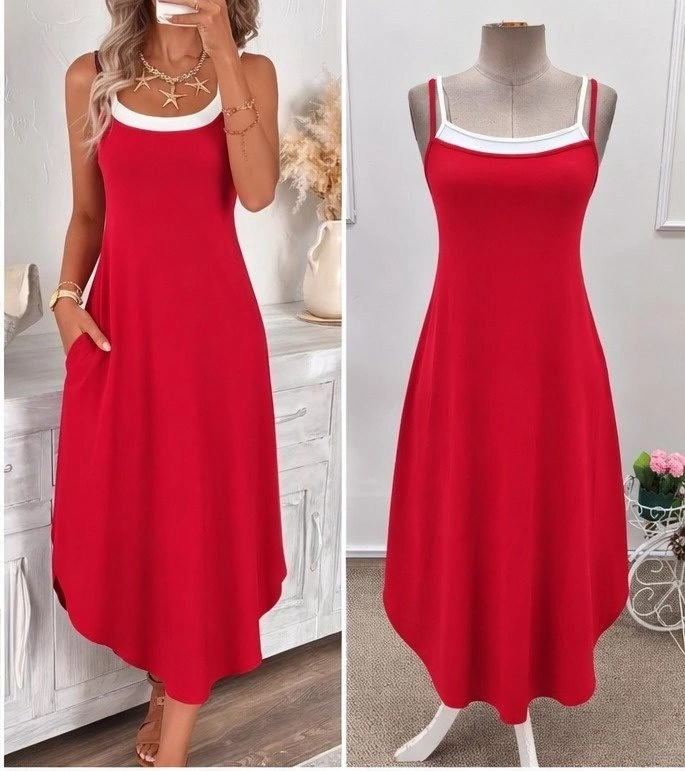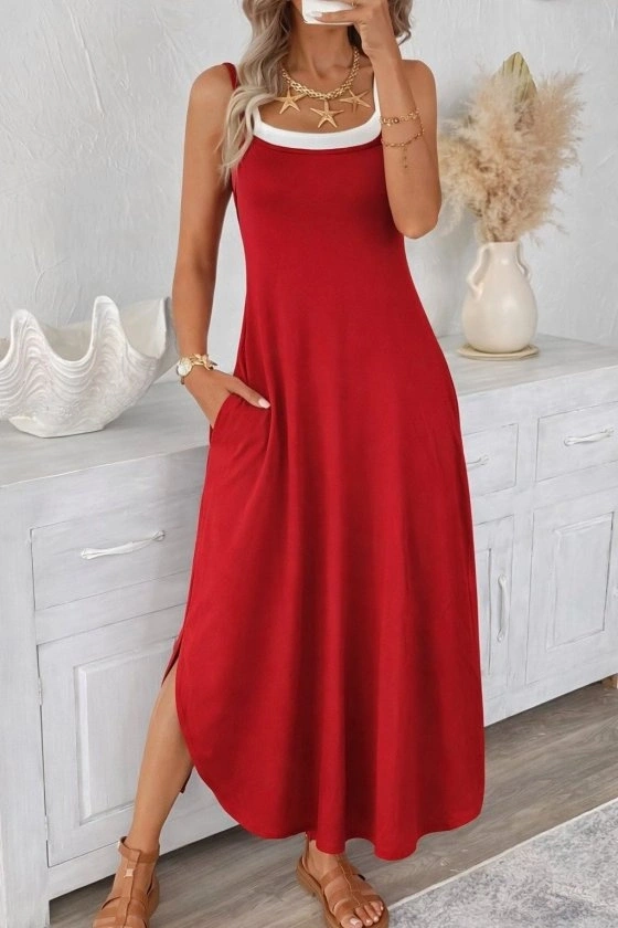 Kadın Ip Askılı Yuvarlak Yakalı Cepli Uzun Viskon Elbise