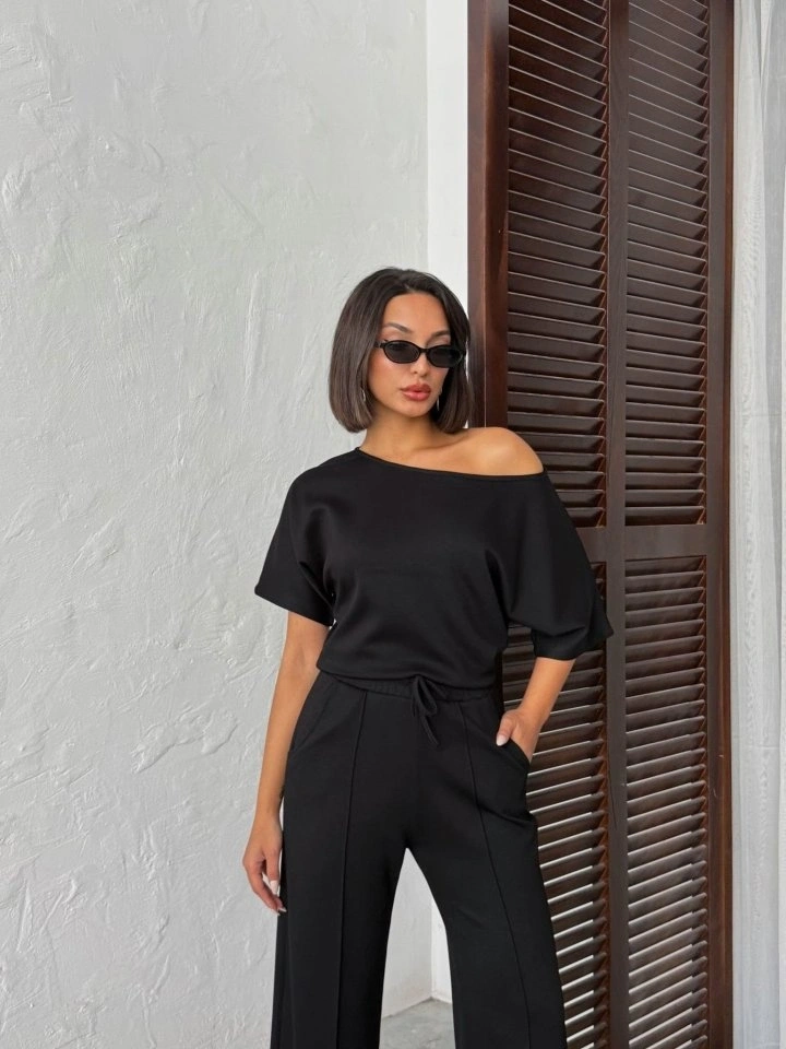 Kadın İsa Kollu Kayık Yaka Bluz Ve Pantolon Misal Kumaş Ikili Takım