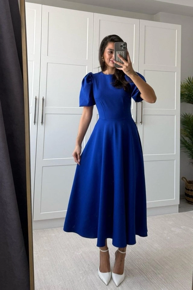 Kadın Kısa Balon Kollu Bisiklet Yaka Geniş Kesim Janjan Krep Elbise