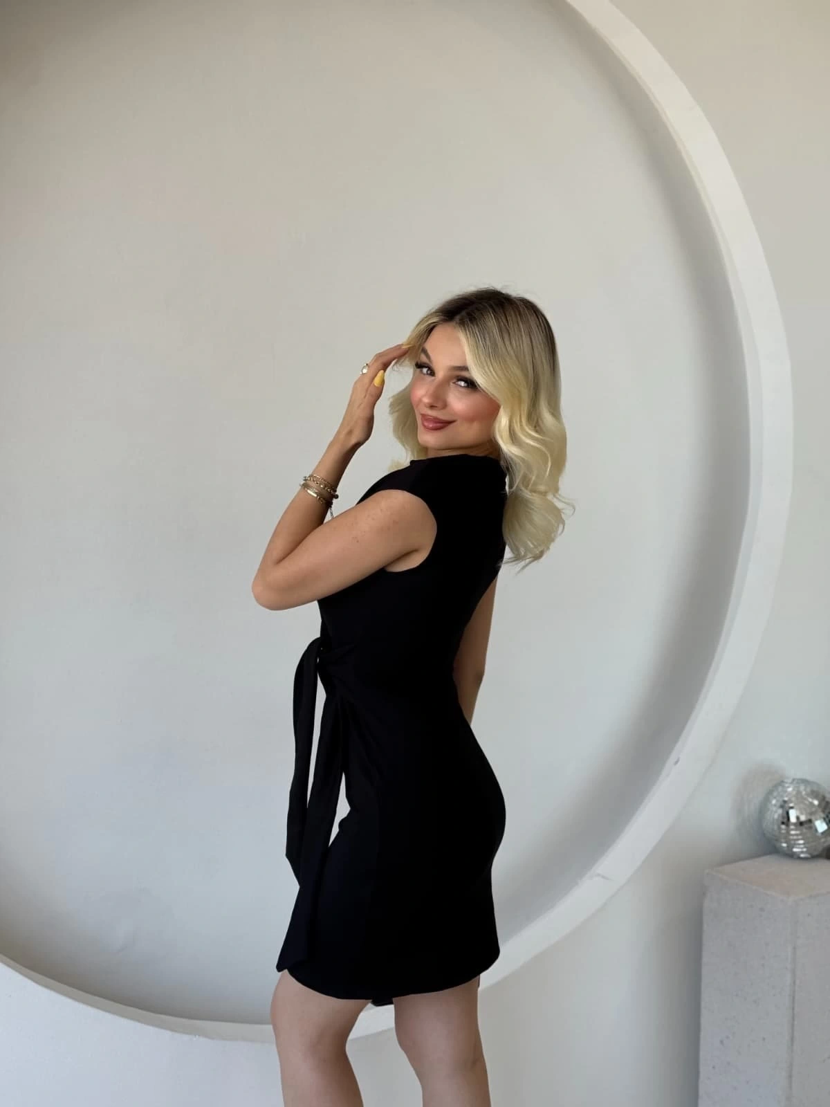 Kadın Kısa Kap Kollu Bisiklet Yaka Belden Bağlamalı Modal Mini Elbise