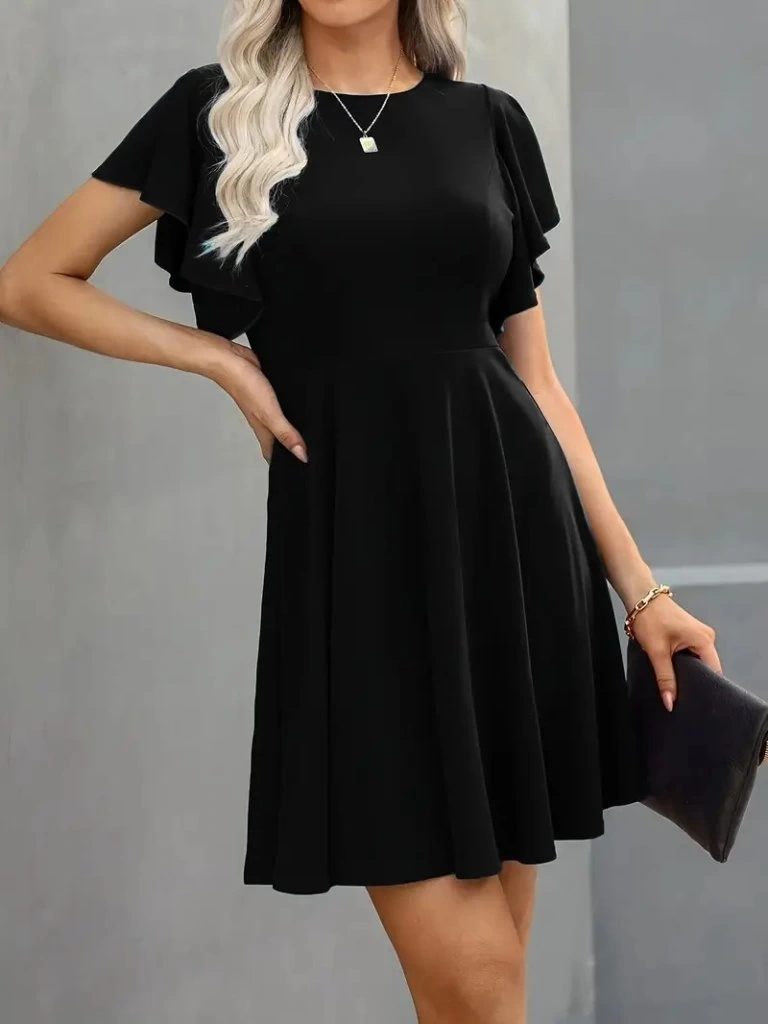 Kadın Kısa Kelebek Kollu Bisiklet Yaka Janjan Krep Elbise
