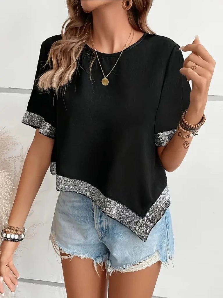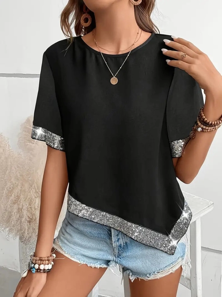 Kadın Kısa Kollu Bisiklet Yaka Asimetrik Kesim Detaylı Pul Payetli Krep Bluz