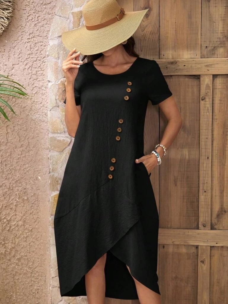 Kadın Kısa Kollu Bisiklet Yaka Düğme Detay Müslim Elbise
