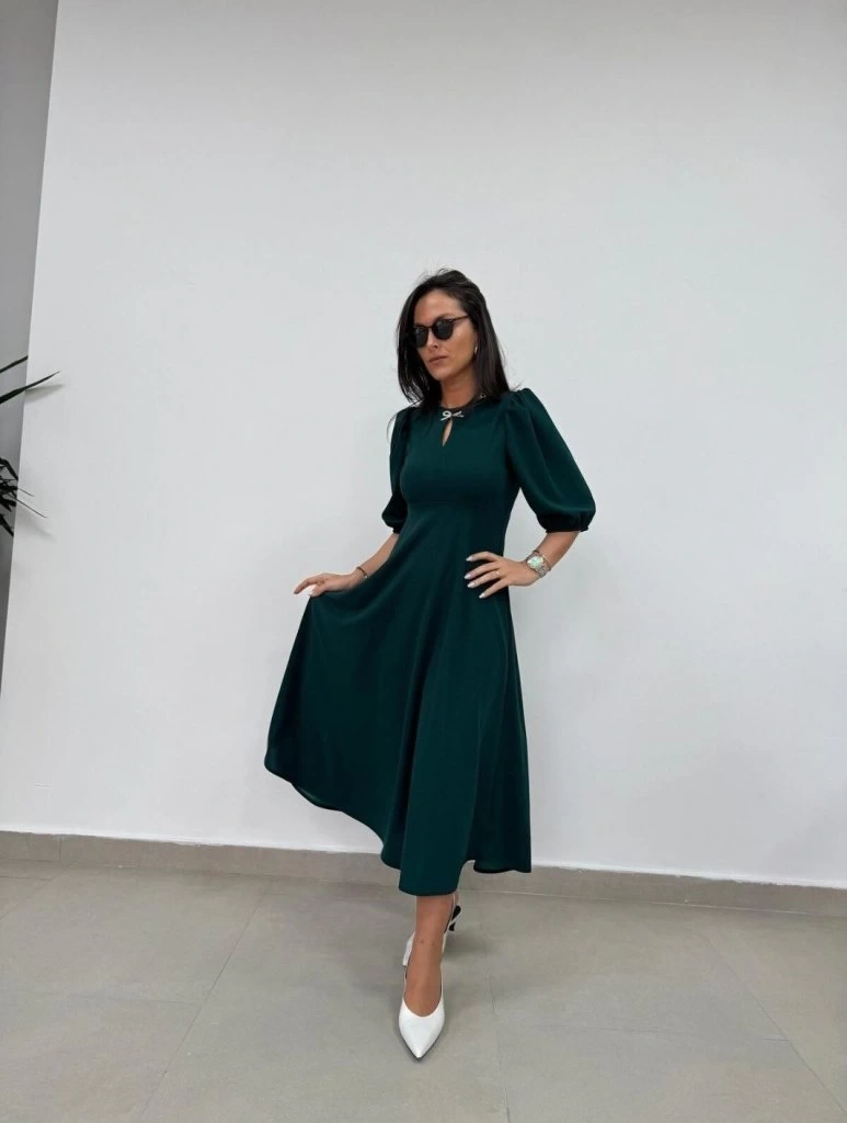 Kadın Kısa Kollu Bisiklet Yaka Fiyonk Broşlu Midi Janjan Krep Elbise