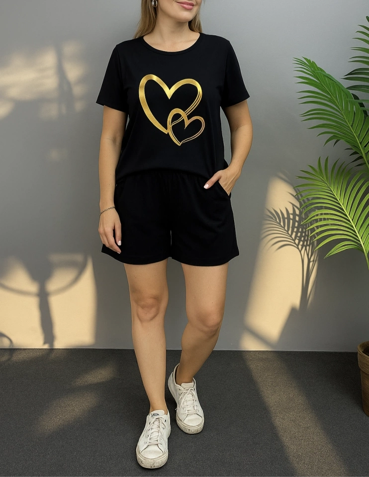 Kadın Kısa Kollu Bisiklet Yaka Viskon Iki Iplik Bluz Ve Short Ikili Takım