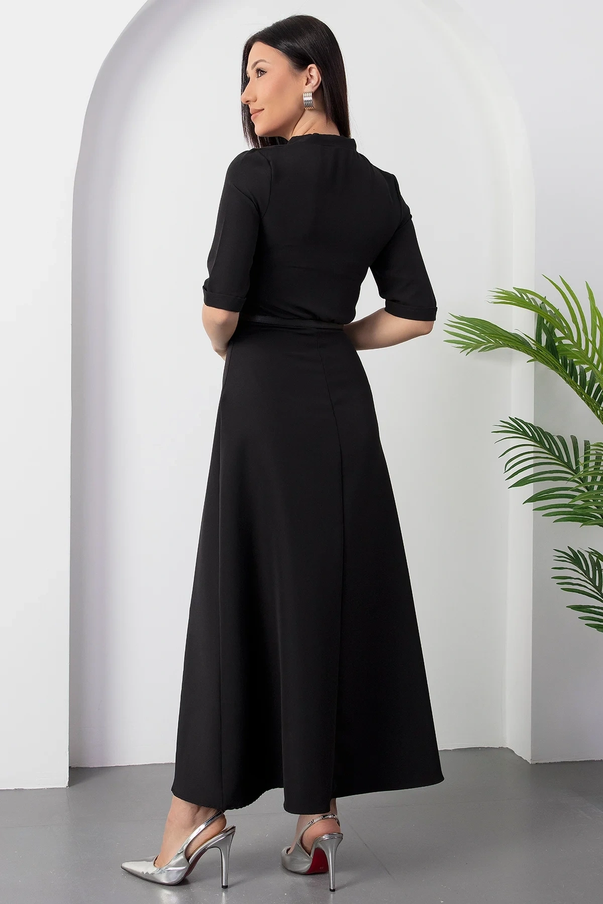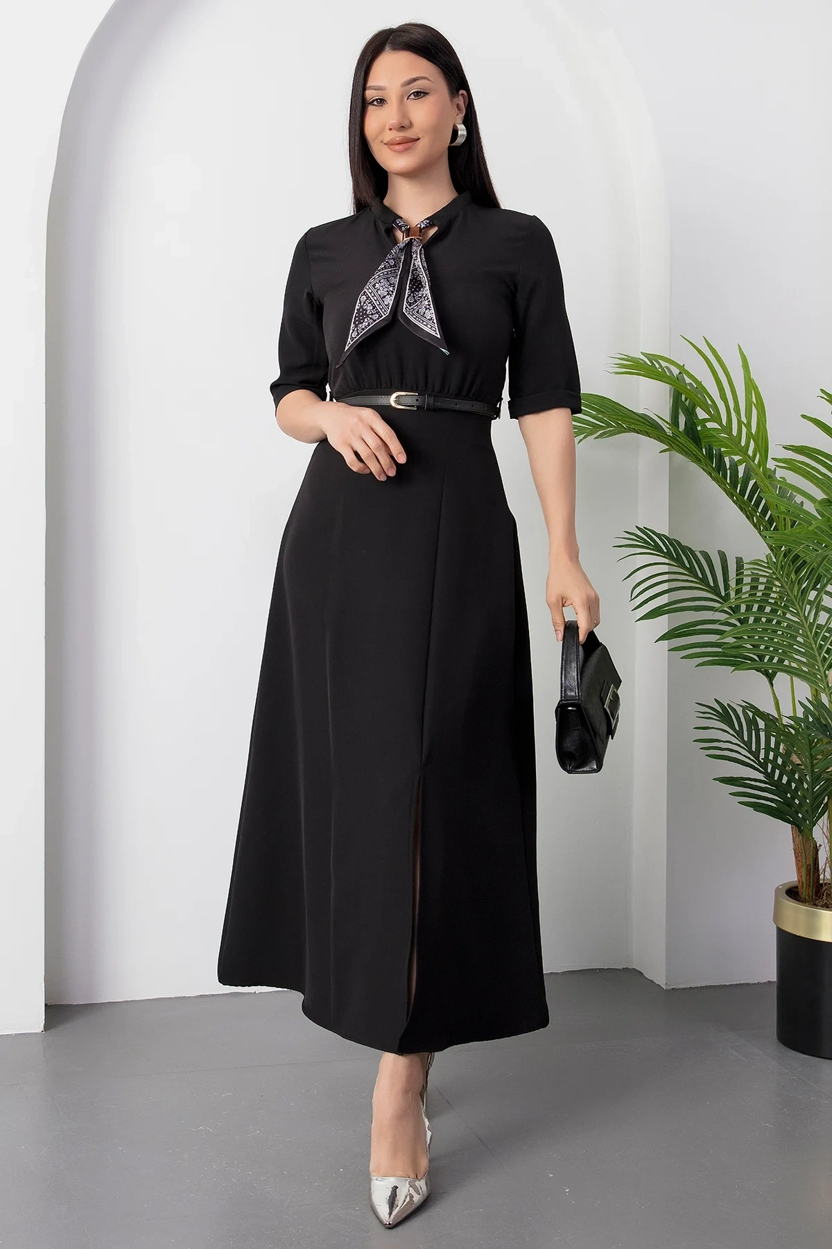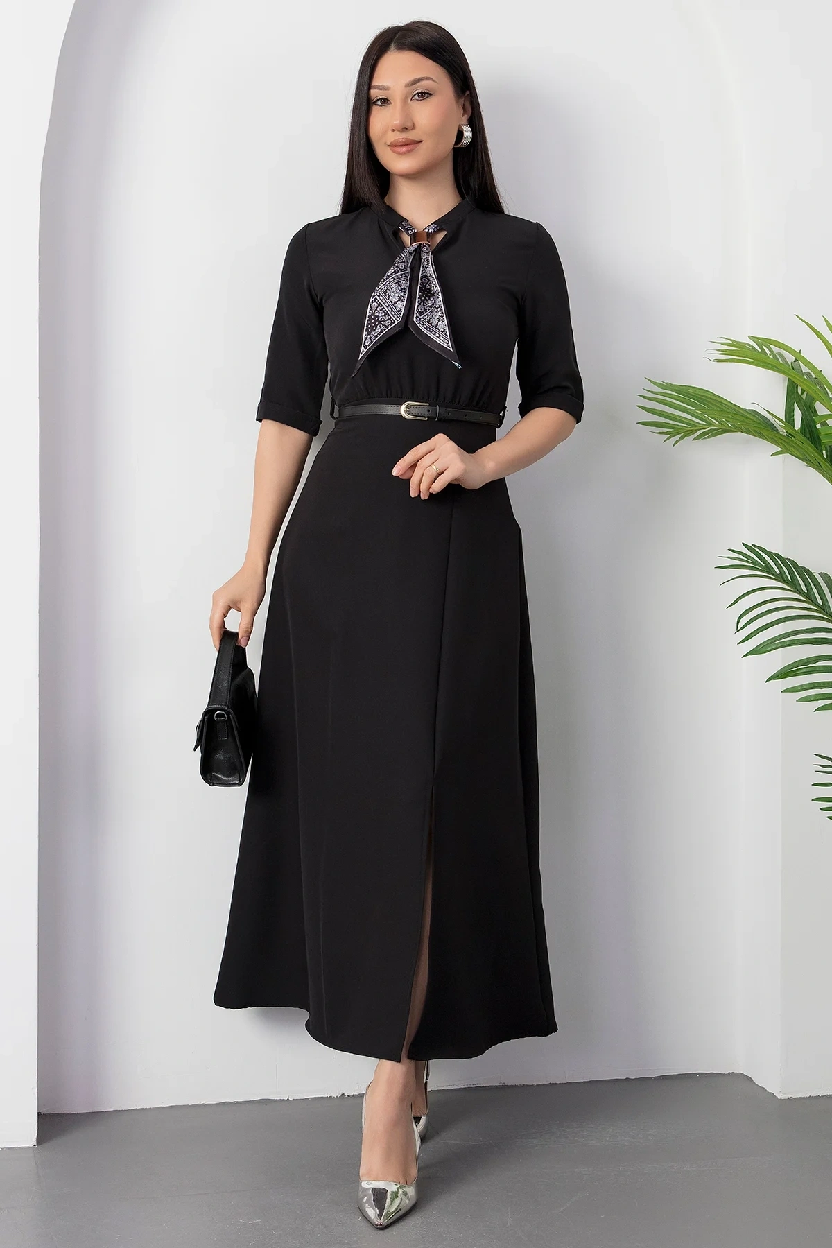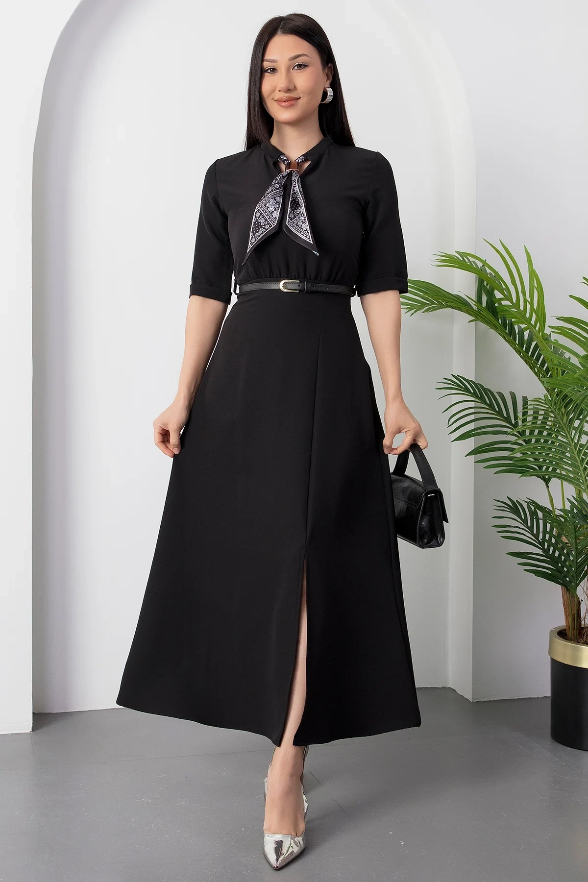 Kadın Kısa Kollu Fular Ve Kemer Detay önden Yırtmaçlı Maxi Boy Elbise